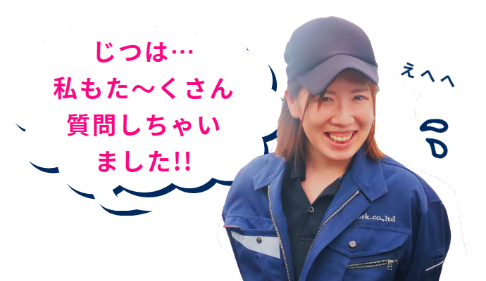 そして面接に行くと面接官が女性の方(課長)でビックリ!思わず不安に思っていることを沢山聞いてしまいました^^;そんな私の質問に一つひとつ丁寧に答えてくださり、そのおかげで安心して入社できました!